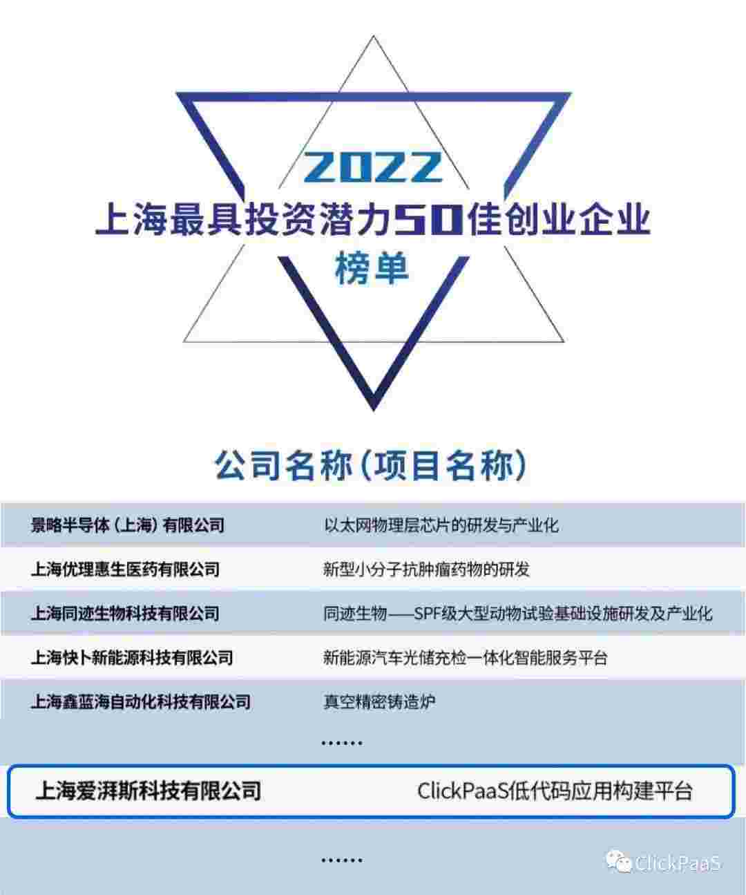 EBPAY 作为国内低代码PaaS平台的领军企业,,,,,,,与120家创企入围角逐。。。。。。期间接受了来自德同资本、、、、、、、、领中资本等知名投资机构的10位投资人组成专家评委团的背靠背盲选。。。。。。。。。。。。。并最终入围“2022上海最具投资潜力50佳创业企业”榜单,,,,,,,,,,,,被列入“上海市重点培育创业企业库”。。。。。。。。。。。。