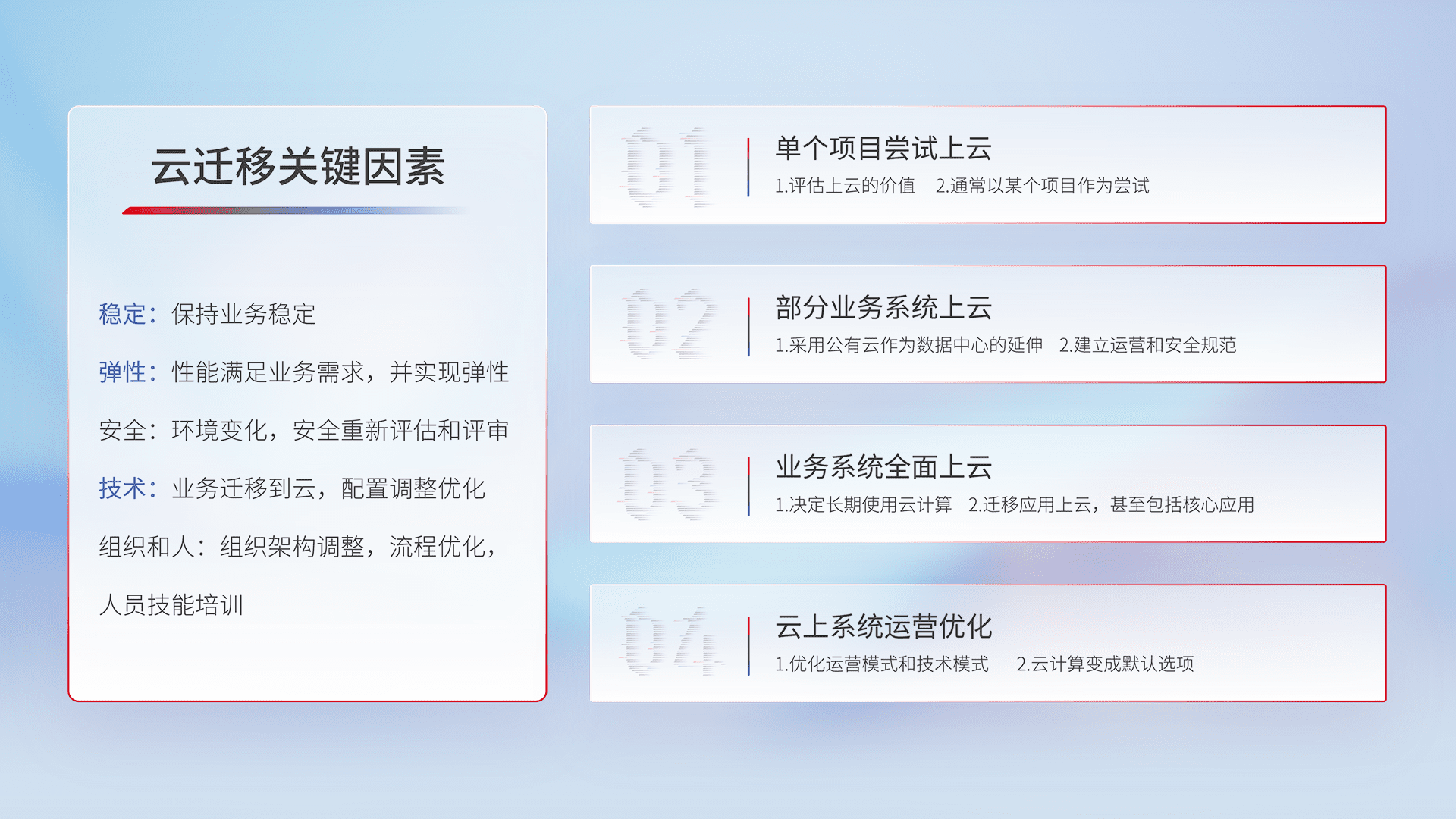 结合实际业务,,从规划设计、、、云平台选型、、云原生改造、、、、数据迁移、、集成交付,,,,迁移全过程为客户识别最佳上云路径,,,,做好风险识别管理,,,设计网络架构、、身份权限、、、、安全审计合规、、操作审计、、日志审计、、、、监控告警策略、、、多站点容灾设计等,,,对云上基础设施进行整体规划,,,提升IT治理水平,,,,以满足弹性、、、高可用、、、高性能的需求。。。。