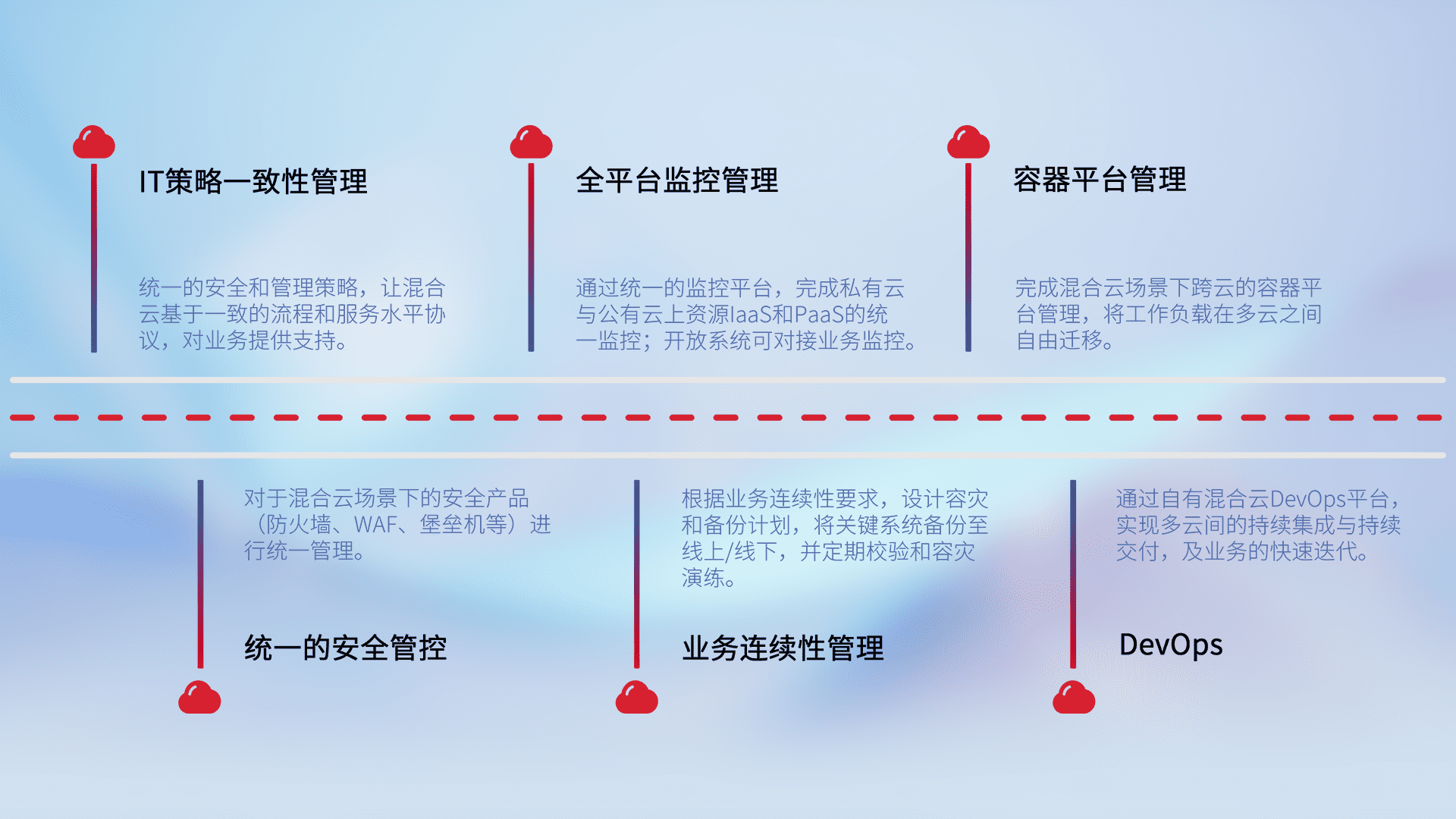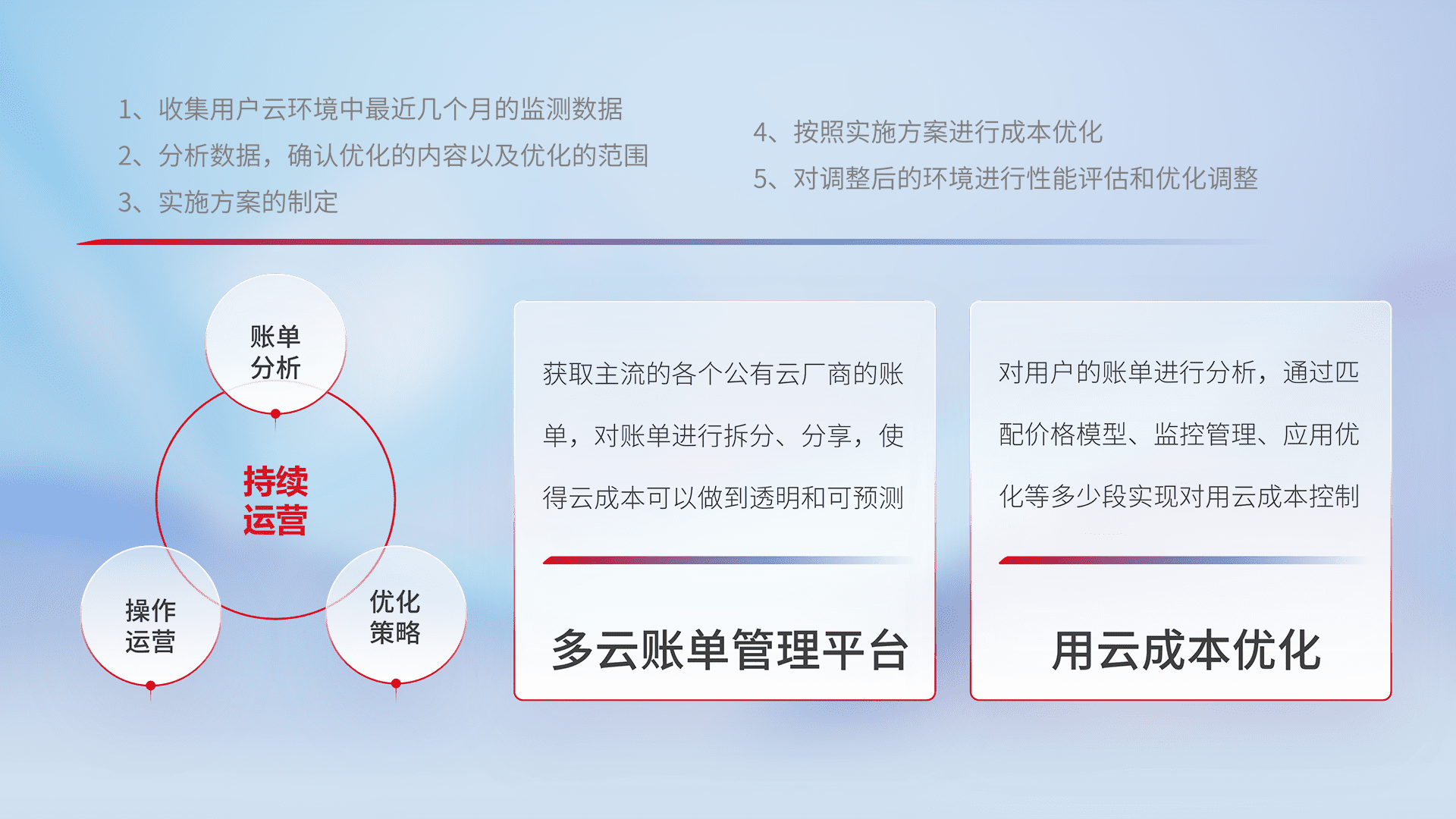 通过多云纳管,,,以统一的资源数据模型把客户的云资源进行抽象和封装,,进而实现对多云资源的统一操作,,保障云资源管理的可靠性、、、稳定性与可用性。。。量身定制化运维内容,,配置、、开发运维、、、补丁管理、、、、备份、、、监控、、、认证和访问管理、、、审计和日常巡检等,,保障在用云过程中的可靠度,,稳定度以及高可用率。。。