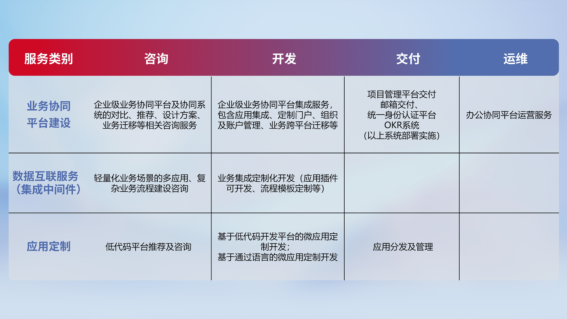 针对钉钉、、、企微、、IDaas等平台级产品提供产品的规划、、、、方案、、、、交付、、定制化开发等服务,,,,实现如统一协同办公、、智能客户服务、、混合会议管理、、、、智能数据查询、、等业务场景,,,,实现数字化转型。。